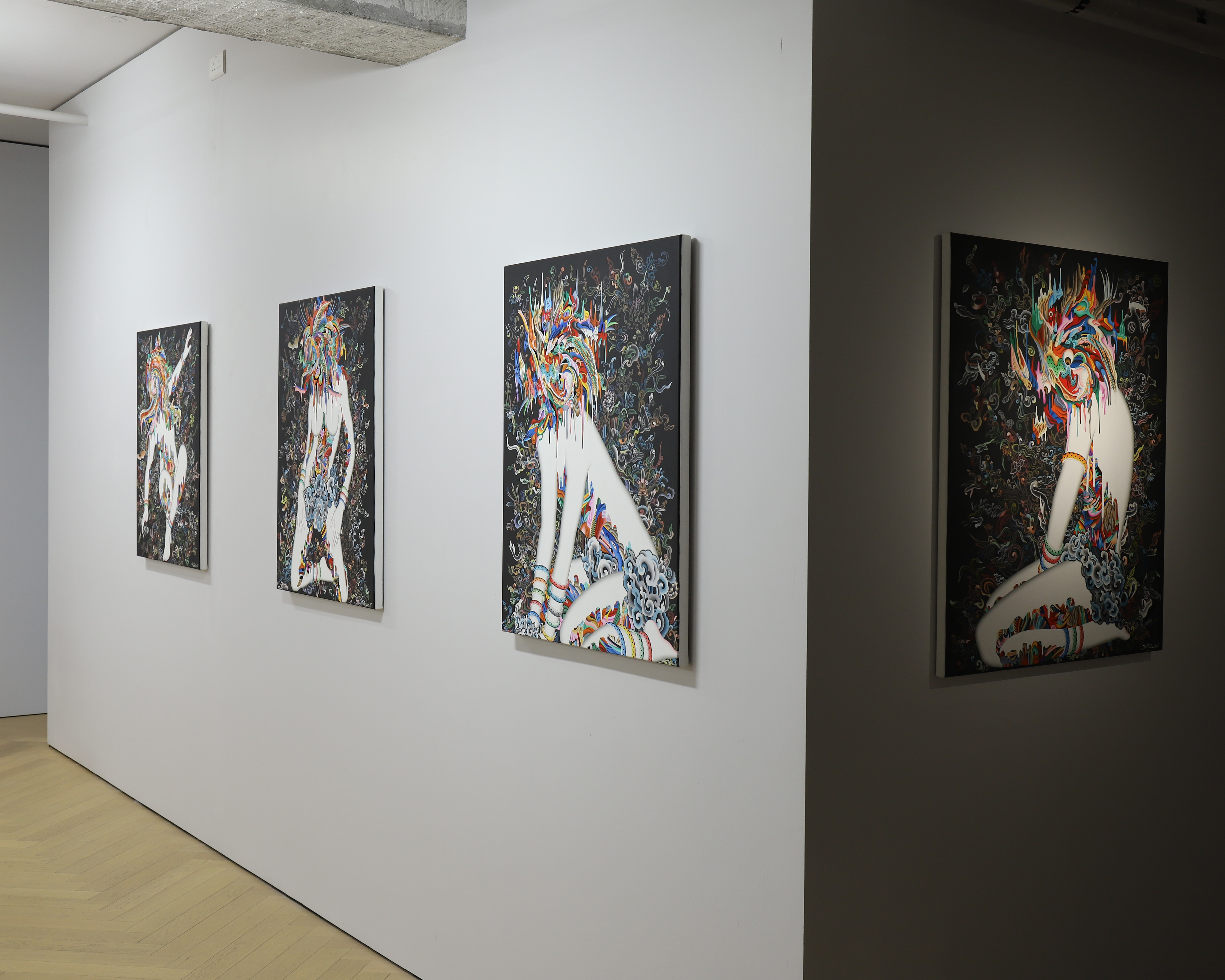 Through the present series, Sherpa delves into the unprecedented, negative chaos of the contemporary world, reimagining the spirits as characters processing its fluctuating emotions. The black background mirrors the chaos of the world in which he finds himself. As the spirits inhabit and transform the darkness, the artist navigates the changing realities around him. Thus, the spirits in Hello Darkness…My Old Friend explore new, darker terrains, as they playfully assert their resolve to thrive and transform the modern world.